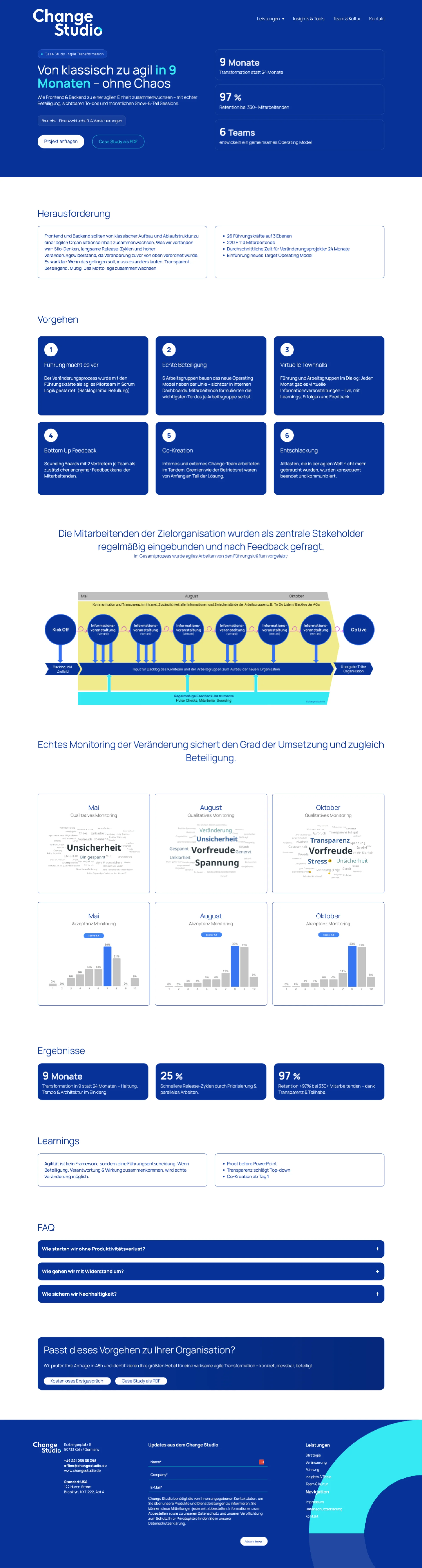 Für das Beratungsunternehmen Change Studio aus Köln – spezialisiert auf Strategie, Veränderung und Führung – habe ich eine Website entwickelt, die Klarheit und Umsetzungsstärke ins Zentrum stellt. Der Fokus lag auf einem aufgeräumten, modernen Design mit klarer Struktur und intuitiver Nutzerführung.